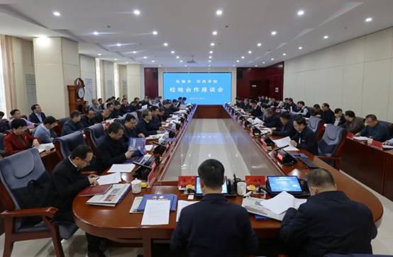 在校地合作座谈会上,市长叶尔波力·孜汗介绍了校地合作情况,他说,多年来,河西学院全力服务张掖经济社会发展,双方形成了互促共赢的良好局面。希望双方充分发挥各自优势,进一步深化全方位、多领域合作,携手推动校地共同发展。校长李广介绍了学校在人才援疆、乡村振兴战略实施、祁连山生态环境保护、红色文化、河西历史文化研究等办学成效。希望校地共同拓展合作领域,创新合作方式,推动产学研用一体化,支持学校早日建成河西大学,为张掖市经济社会发展和产业升级贡献力量。与会市委常委、市领导、学校专家教授就校地合作高质量发展作了发言。